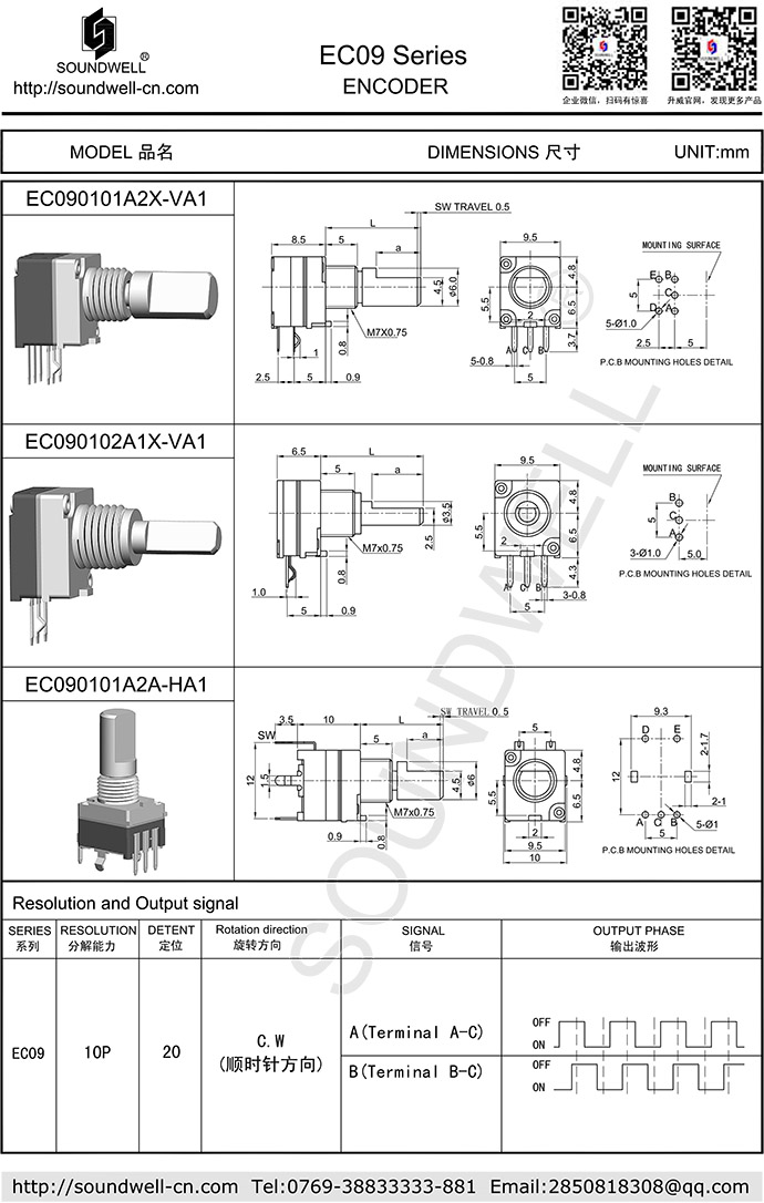 EC09開關(guān)編碼器優(yōu)點:體積小,密封性好,可以帶按壓開關(guān),有立式及臥式兩種安裝方式,軸心形狀及長度可調(diào)整。